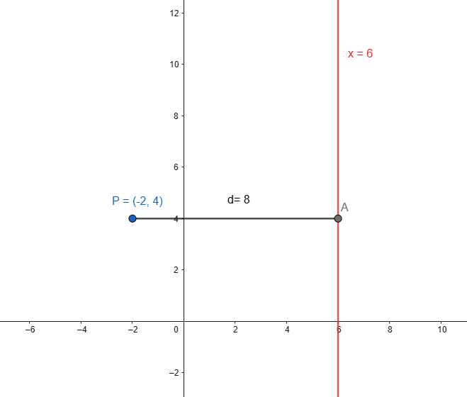 Dato il punto \(P(-2,4)\) e la retta di equazione \(x=6\), la distanza tra punto e retta si può calcolare applicando la (4):